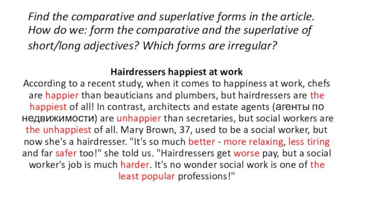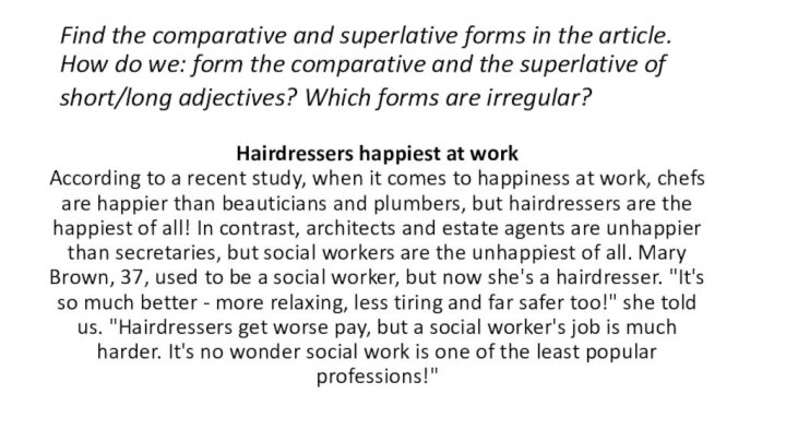 According to a recent study, when it comes to happiness at work, chefs are happier than beauticians and plumbers, but hairdressers are the happiest of all! In contrast, architects and estate agents are unhappier than secretaries, but social workers are the unhappiest of all. Mary Brown, 37, used to be a social worker, but now she's a hairdresser. "It's so much better - more relaxing, less tiring and far safer too!" she told us. "Hairdressers get worse pay, but a social worker's job is much harder. It's no wonder social work is one of the least popular professions!"