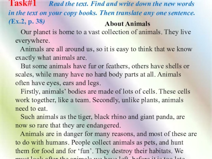 Firstly, animals’ bodies are made of lots of cells. These cells work together, like a team. Secondly, unlike plants, animals need to eat.