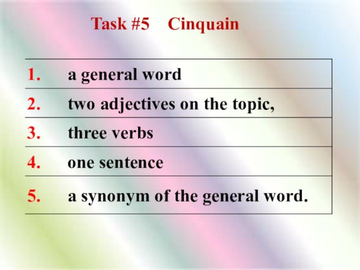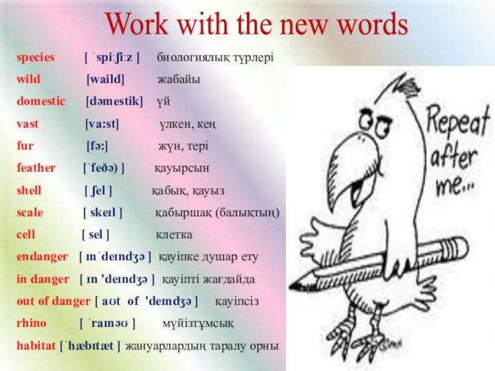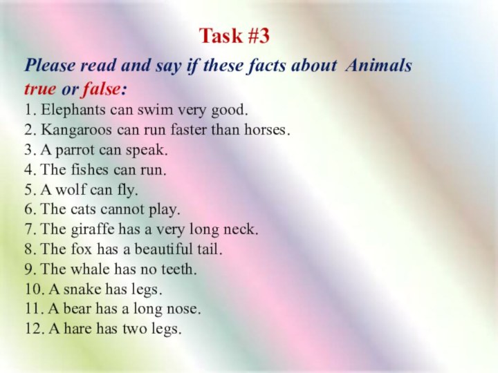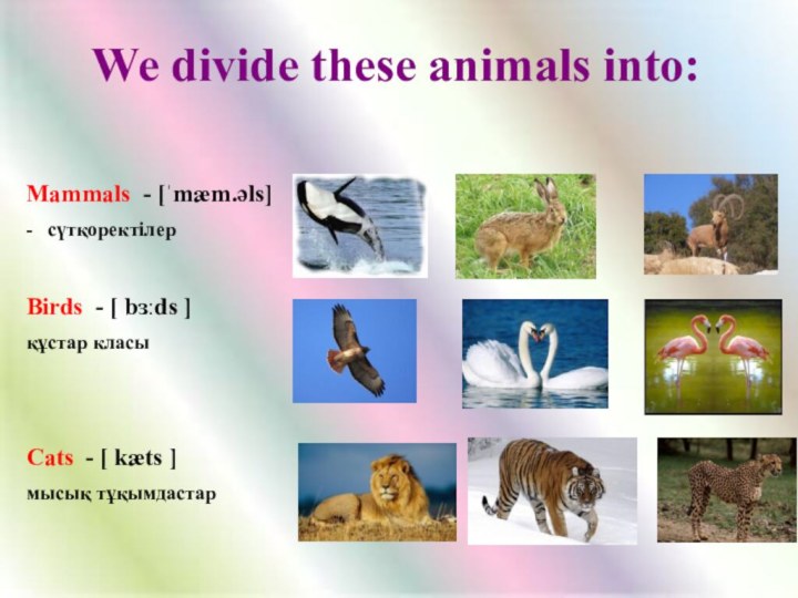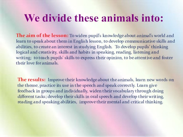 The results: Improve their knowledge about the animals, learn new words on the theme, practice its use in the speech and speak correctly. Learn give feedback in groups and individually, widen their vocabulary through doing different tasks; develop their skills in oral speech and develop their writing, reading and speaking abilities, improve their mental and critical thinking.
