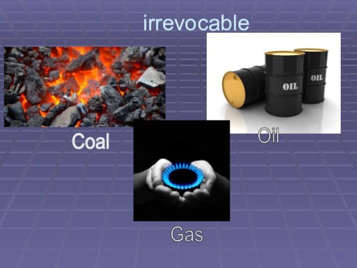 alternative energy irrevocable  Coal Oil Gas Nuclear or atomic energy Hydro-electric power Solar and wind energy