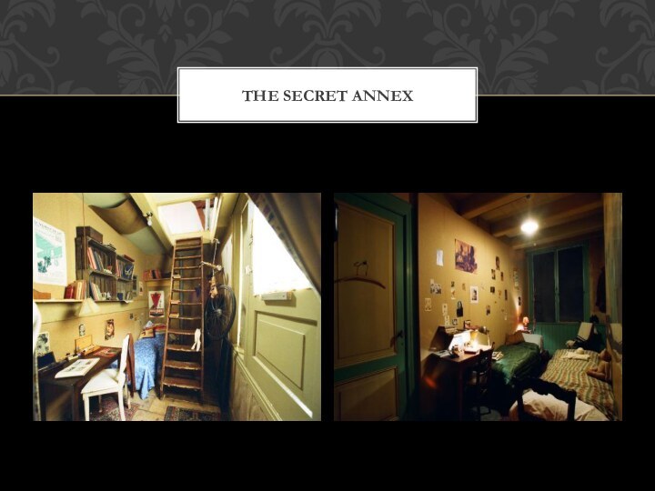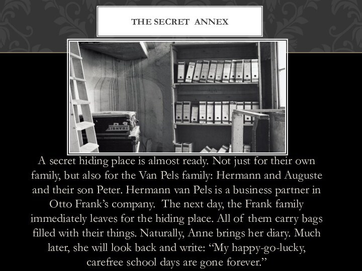 Van Pels family: Hermann and Auguste and their son Peter. Hermann van Pels is a business partner in Otto Frank’s company. The next day, the Frank family immediately leaves for the hiding place. All of them carry bags filled with their things. Naturally, Anne brings her diary. Much later, she will look back and write: “My happy-go-lucky, carefree school days are gone forever.”The Secret Annex
