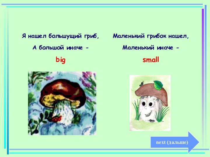 Я нашел большущий гриб,А большой иначе - bigМаленький грибок нашел,Маленький иначе - smallnext (дальше)