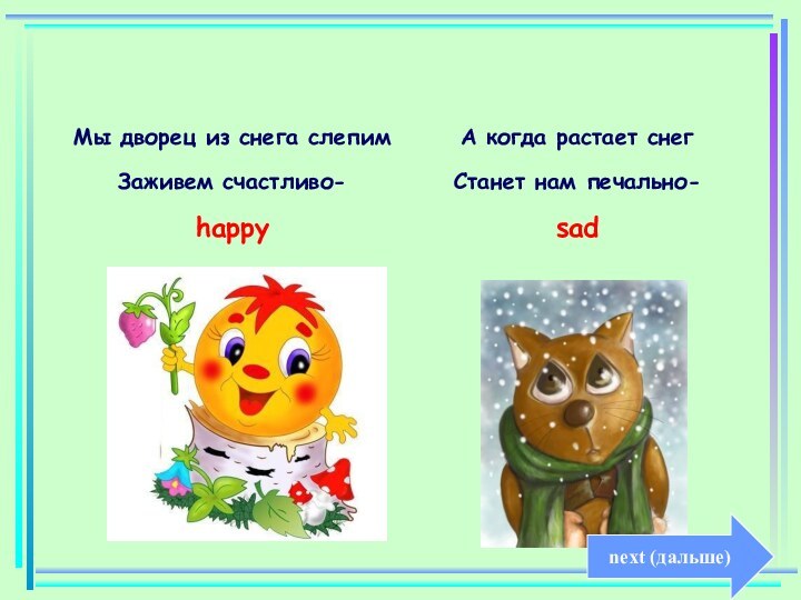 Мы дворец из снега слепимЗаживем счастливо- happyА когда растает снегСтанет нам печально- sadnext (дальше)
