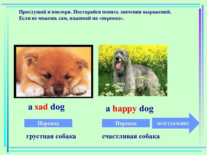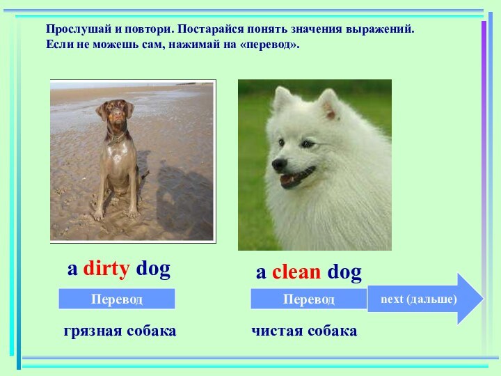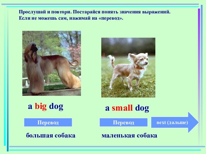 a big doga small dognext (дальше)Прослушай и повтори. Постарайся понять значения