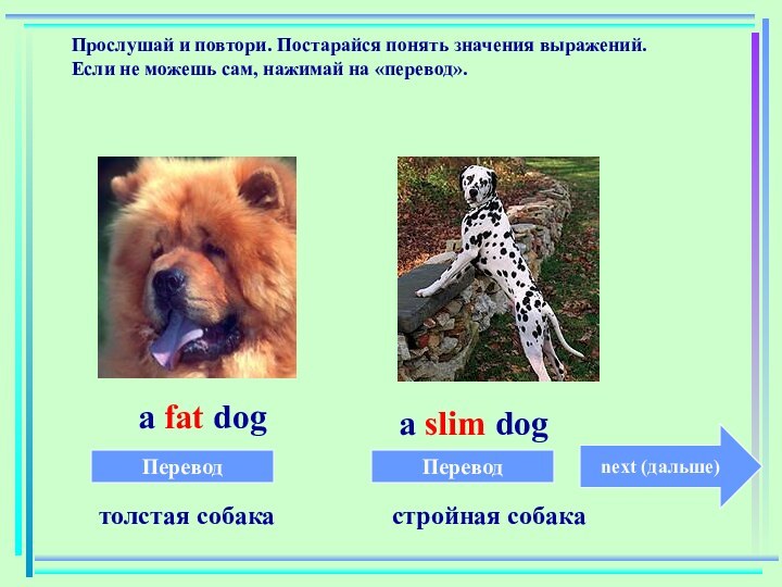 a fat doga slim dogПереводПереводПрослушай и повтори. Постарайся понять значения выражений.Если