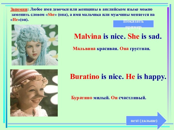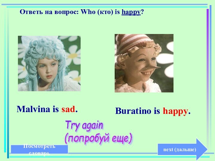 Ответь на вопрос: Who (кто) is happy?Buratino is happy. next (дальше)Malvina