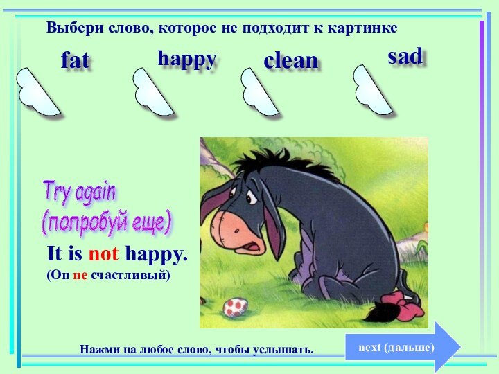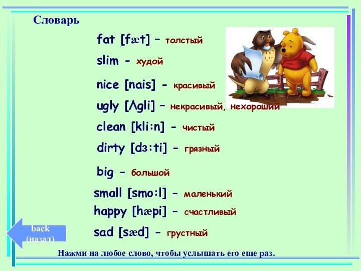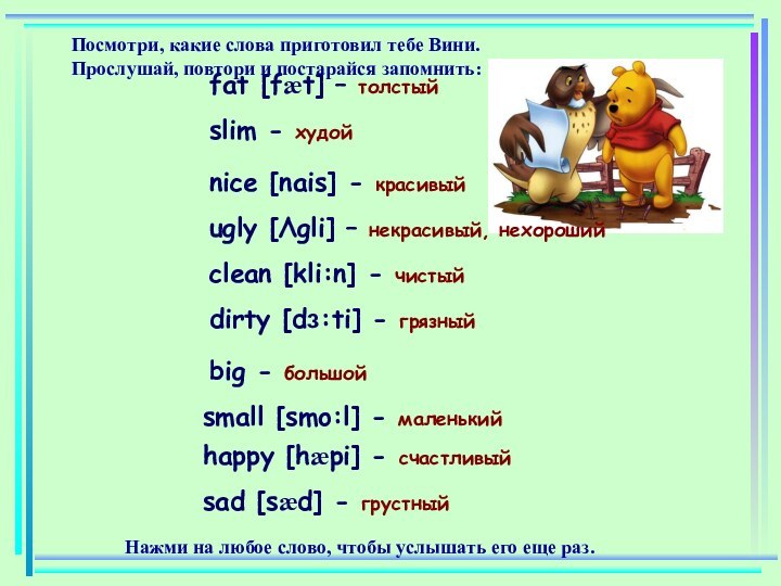 fat [fæt] – толстый Посмотри, какие слова приготовил тебе Вини. Прослушай, повтори и постарайся запомнить:Нажми на любое слово, чтобы услышать его еще раз.sad [sæd] - грустныйslim - худойnice [nais] - красивыйugly [Λgli] – некрасивый, нехорошийclean [kli:n]