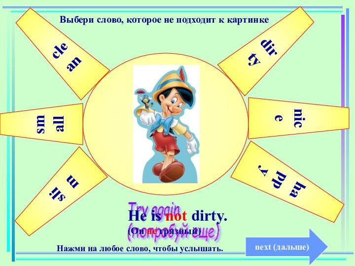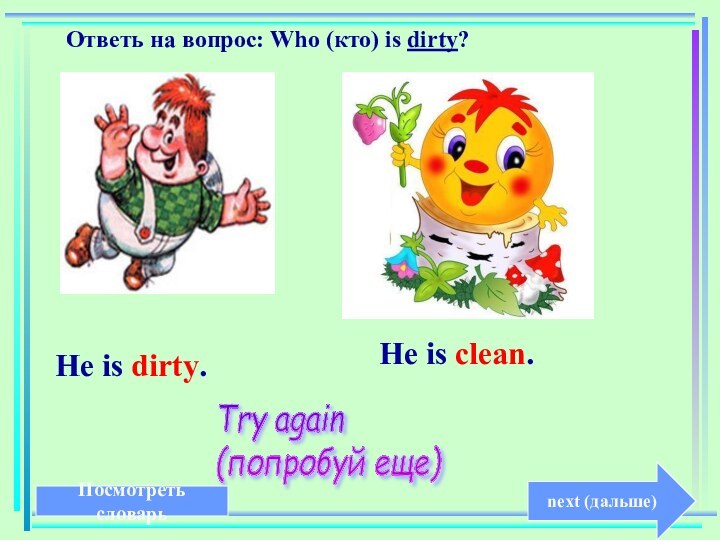Ответь на вопрос: Who (кто) is dirty?next (дальше)He is dirty. Try