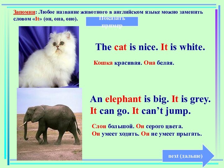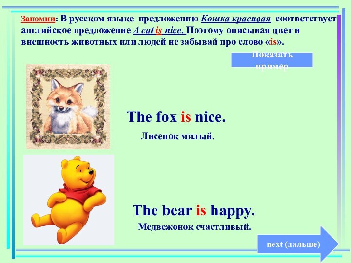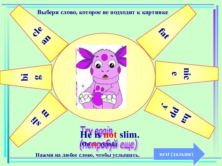 Как ты думаешь, чем животные, кроме окраски, могут отличаться друг от друга? fat [fæt] – толстый Посмотри, какие слова приготовил тебе Вини. Прослушай, повтори Если много съешь конфет,Будешь очень толстым – fatА не съешь– не хватит a fat doga slim dogПереводПереводПрослушай и повтори. Постарайся понять значения выражений.Если не Приятный и хороший Стас    Любезный, милый, славный - niceВезде a nice dogan ugly dogПрослушай и повтори. Постарайся понять значения выражений.Если не Журавлиный летит клинВ чистом небе, чистый- cleanГрязный пол вы подметете?Грязный по-английски - dirtynext (дальше) a dirty doga clean dogПрослушай и повтори. Постарайся понять значения выражений.Если не Я нашел большущий гриб,А большой иначе - bigМаленький грибок нашел,Маленький иначе - smallnext (дальше) a big doga small dognext (дальше)Прослушай и повтори. Постарайся понять значения выражений.Если Мы дворец из снега слепимЗаживем счастливо- happyА когда растает снегСтанет нам печально- sadnext (дальше) a sad doga happy dognext (дальше)Прослушай и повтори. Постарайся понять значения выражений.Если Запомни: Любое название животного в английском языке можно заменитьсловом «It» (он, она, Запомни: Любое имя девочки или женщины в английском языке можно заменить словом Запомни: В русском языке предложению Кошка красивая соответствуетанглийское предложение A cat is Ответь на вопрос: Who (кто) is happy?Buratino is happy. next (дальше)Malvina is Ответь на вопрос: Who (кто) is ugly?next (дальше)She is nice. Try again Ответь на вопрос: Who (кто) is small?next (дальше)A mouse is small. Try Ответь на вопрос: Who (кто) is fat?next (дальше)The cat is slim. Try Ответь на вопрос: Who (кто) is dirty?next (дальше)He is dirty. Try again Нажми на любое слово, чтобы услышать.Выбери слово, которое не подходит к картинкеfathappycleansadTry Нажми на любое слово, чтобы услышать.Выбери слово, которое не подходит к картинкеniceuglycleansmallTry Нажми на любое слово, чтобы услышать.Выбери слово, которое не подходит к картинкеTry Нажми на любое слово, чтобы услышать.Выбери слово, которое не подходит к картинкеTry She is slim.She is clean.She is nice.Who is it?Отгадай загадку:Try again He is fat.He is nice.He is happy.He can fly.Who is it?Отгадай загадку:Try He is fat.He is big.He is ugly.Who is it?Отгадай загадку:Try again fat [fæt] – толстый Нажми на любое слово, чтобы услышать его еще fat [fæt] – толстый Нажми на любое слово, чтобы услышать его еще fat [fæt] – толстый Нажми на любое слово, чтобы услышать его еще fat [fæt] – толстый Нажми на любое слово, чтобы услышать его еще fat [fæt] – толстый Нажми на любое слово, чтобы услышать его еще Кузнецова Ольга Михайловна