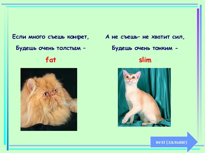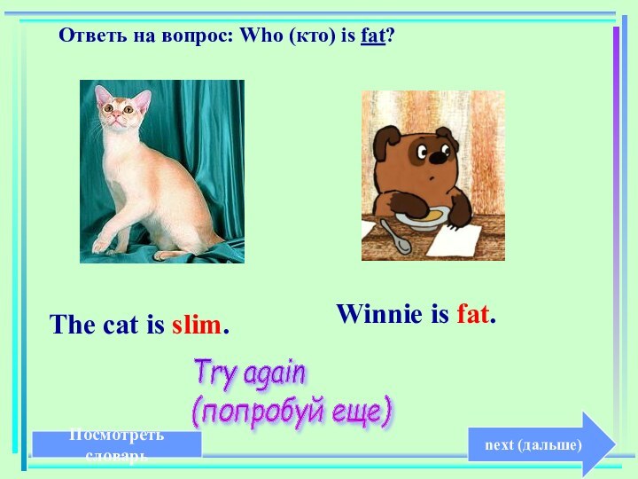 Ответь на вопрос: Who (кто) is fat?next (дальше)The cat is slim.