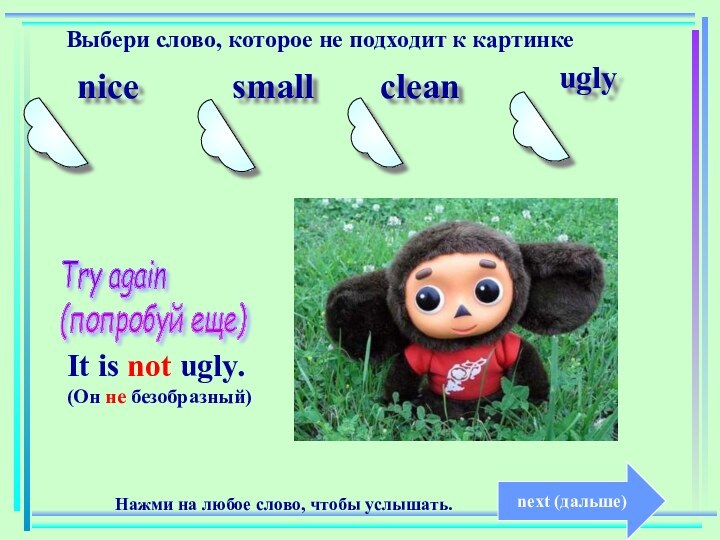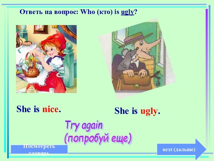 Ответь на вопрос: Who (кто) is ugly?next (дальше)She is nice. Try