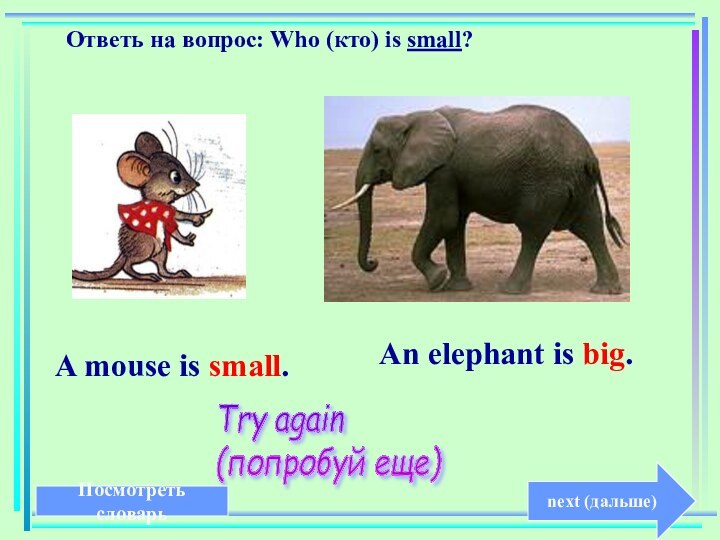 Ответь на вопрос: Who (кто) is small?next (дальше)A mouse is small.