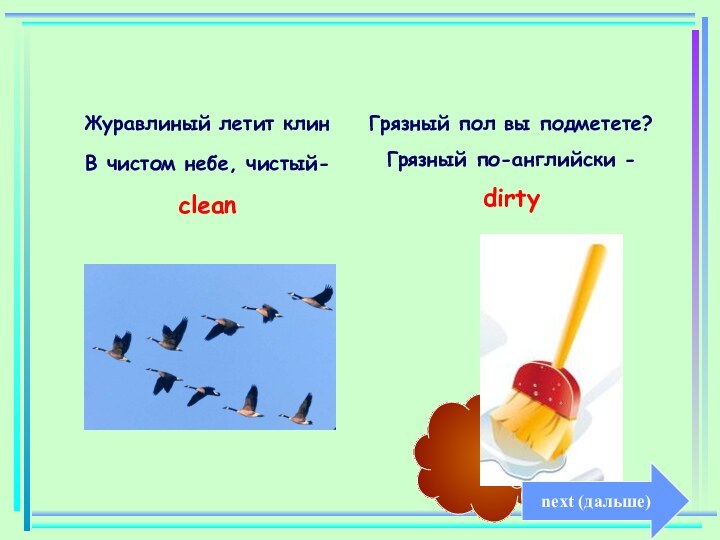 Журавлиный летит клинВ чистом небе, чистый- cleanГрязный пол вы подметете?Грязный по-английски - dirtynext (дальше)