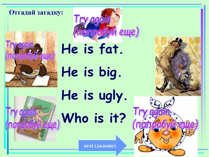 He is fat.He is big.He is ugly.Who is it?Отгадай загадку:Try again
