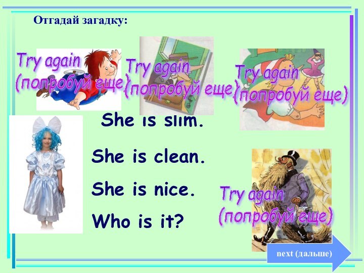 She is slim.She is clean.She is nice.Who is it?Отгадай загадку:Try