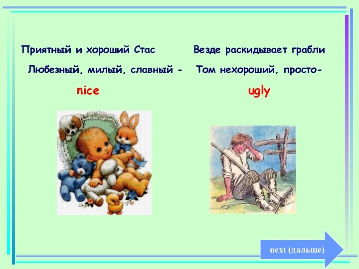 Приятный и хороший Стас  Любезный, милый, славный - niceВезде раскидывает граблиТом нехороший, просто- uglynext (дальше)