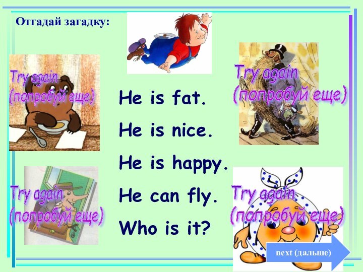 He is fat.He is nice.He is happy.He can fly.Who is it?Отгадай