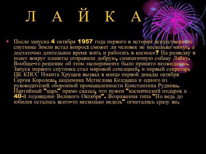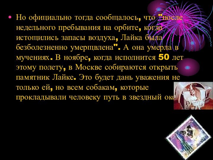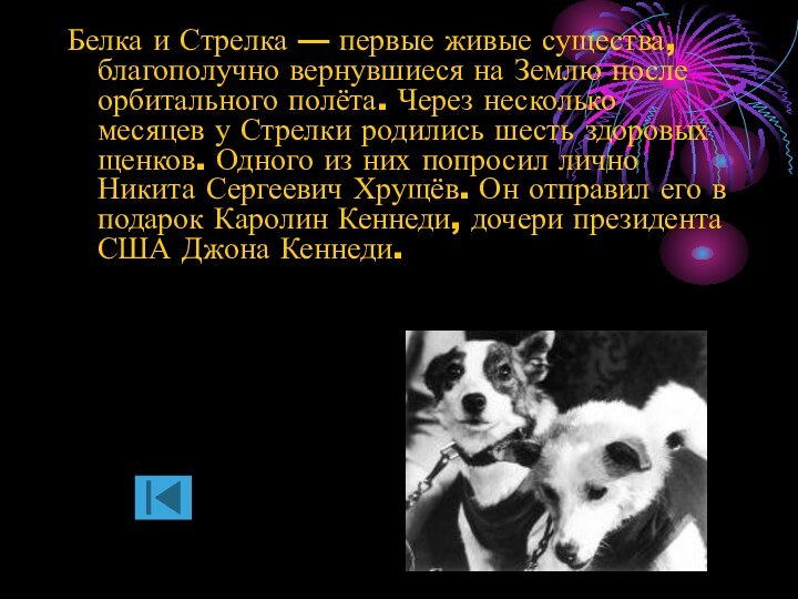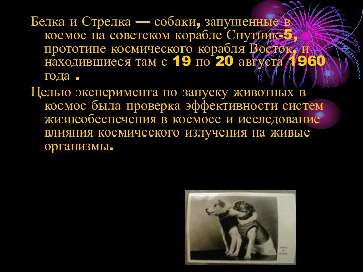 находившиеся там с 19 по 20 августа 1960 года .Целью эксперимента по запуску животных в космос была проверка эффективности систем жизнеобеспечения в космосе и исследование влияния космического излучения на живые организмы.