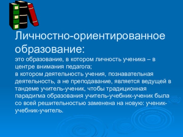 в котором деятельность учения, познавательная деятельность, а не преподавание, является ведущей в тандеме учитель-ученик, чтобы традиционная парадигма образования учитель-учебник-ученик была со всей решительностью заменена на новую: ученик-учебник-учитель.