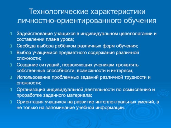 Технологические характеристики личностно-ориентированного обучения Задействование учащихся в индивидуальном целеполагании