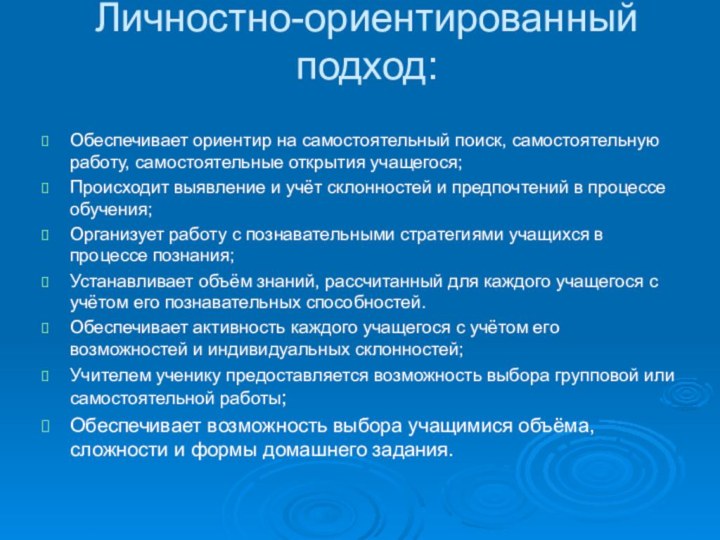 в процессе обучения; Организует работу с познавательными стратегиями учащихся в процессе познания; Устанавливает объём знаний, рассчитанный для каждого учащегося с учётом его познавательных способностей. Обеспечивает активность каждого учащегося с учётом его возможностей и индивидуальных склонностей; Учителем ученику предоставляется возможность выбора групповой или самостоятельной работы; Обеспечивает возможность выбора учащимися объёма, сложности и формы домашнего задания.