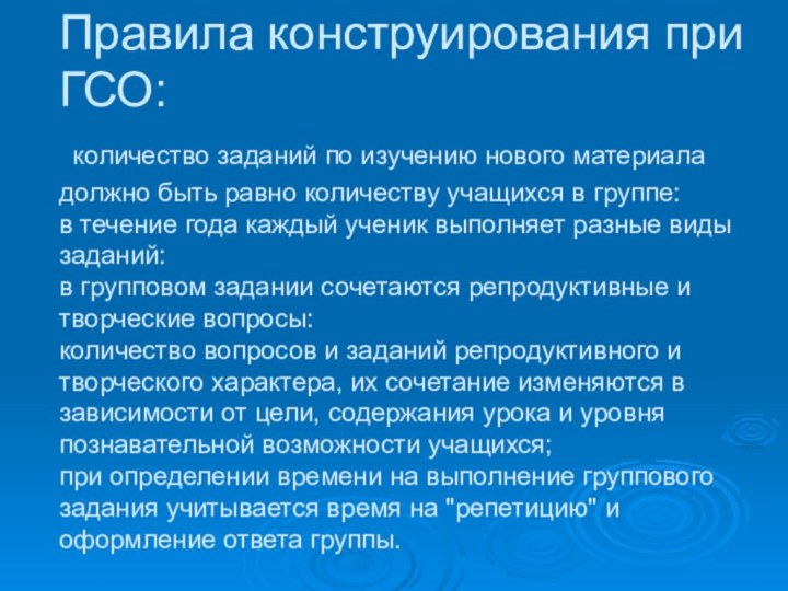 количество вопросов и заданий репродуктивного и творческого характера, их сочетание изменяются в зависимости от цели, содержания урока и уровня познавательной возможности учащихся;