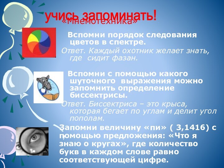 Запомни величину «пи» ( 3,1416) с помощью предложения: «Что я знаю о кругах», где количество букв в каждом слове равно соответствующей цифре.