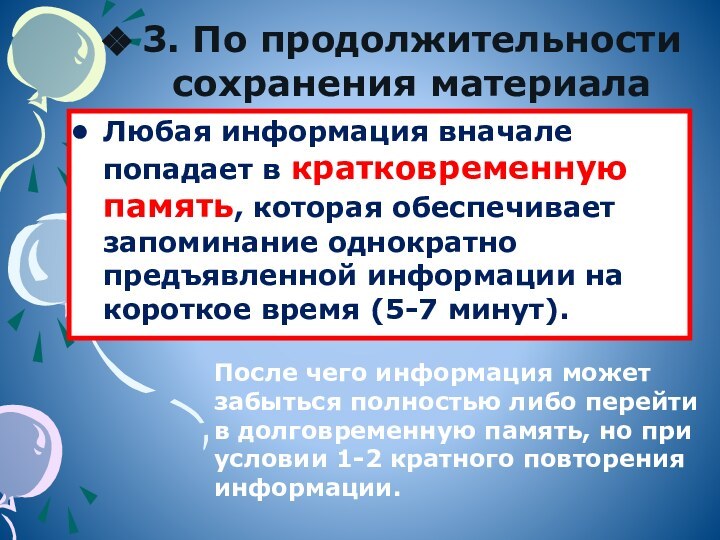 После чего информация может забыться полностью либо перейти в долговременную память, но при условии 1-2 кратного повторения информации.