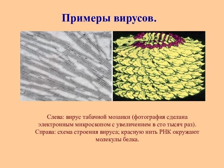 Слайд 9 Слева: вирус табачной мозаики (фотография сделана электронным микроскопом