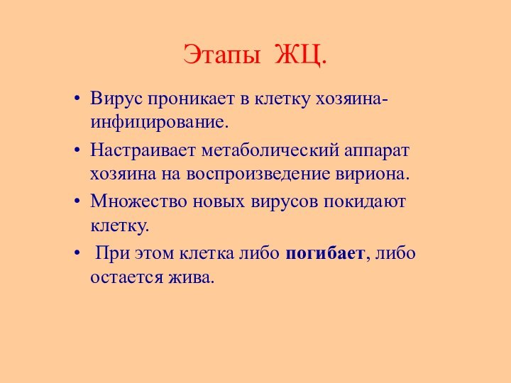 Этапы ЖЦ.Вирус проникает в клетку хозяина- инфицирование.Настраивает метаболический аппарат хозяина на