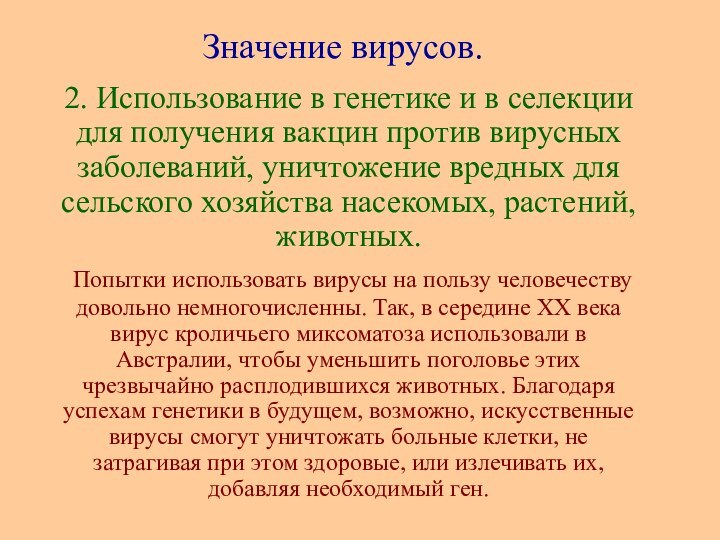 Значение вирусов.1. Вирусы являются возбудителями многих опасных болезней человека, животных и