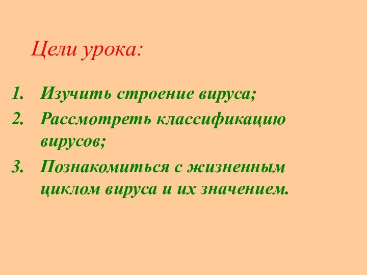 Цели урока:Изучить строение вируса;Рассмотреть классификацию вирусов;Познакомиться с жизненным циклом вируса и их значением.