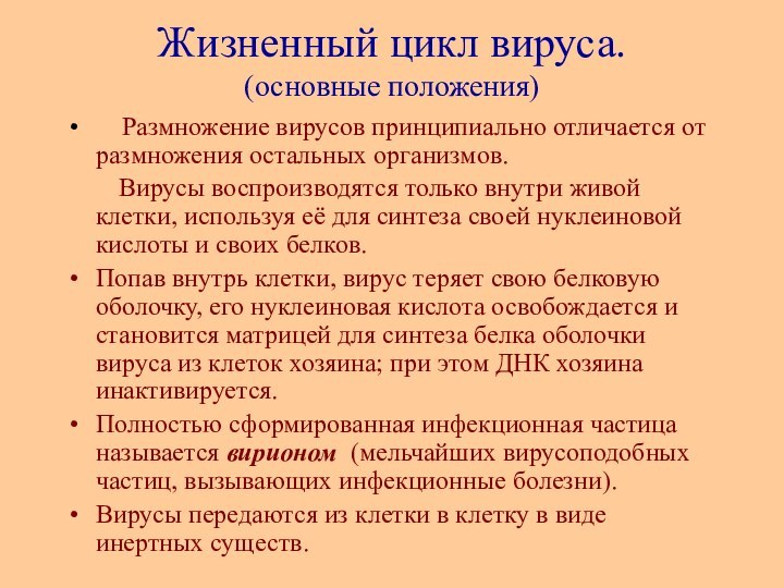 Слайд 13 Жизненный цикл вируса. (основные положения)