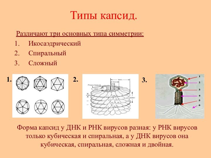 Типы капсид.Различают три основных типа симметрии:ИкосаэдрическийСпиральныйСложный 1.2.3.Форма капсид у ДНК и