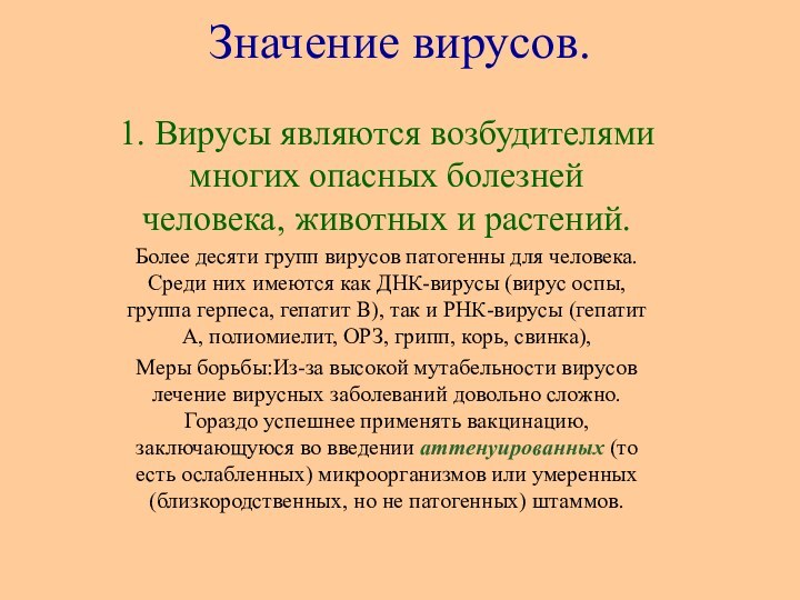 Меры борьбы:Из-за высокой мутабельности вирусов лечение вирусных заболеваний довольно сложно. Гораздо успешнее применять вакцинацию, заключающуюся во введении аттенуированных (то есть ослабленных) микроорганизмов или умеренных (близкородственных, но не патогенных) штаммов.