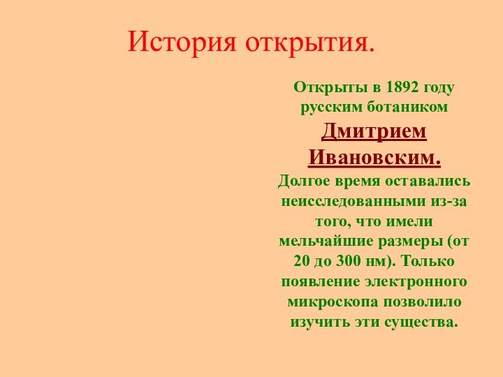 История открытия.Открыты в 1892 году русским ботаником Дмитрием Ивановским. Долгое время