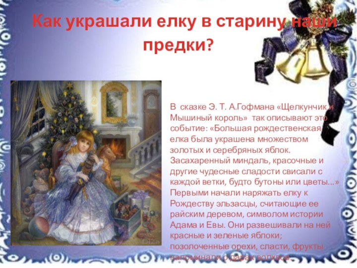 и Мышиный король» так описывают это событие: «Большая рождественская елка была украшена множеством золотых и серебряных яблок. Засахаренный миндаль, красочные и другие чудесные сладости свисали с каждой ветки, будто бутоны или цветы...» Первыми начали наряжать елку к Рождеству эльзасцы, считающие ее райским деревом, символом истории Адама и Евы. Они развешивали на ней красные и зеленые яблоки; позолоченные орехи, сласти, фрукты напоминали о дарах волхвов.