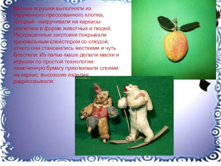 Ватные игрушки выполняли из скрученного прессованного хлопка, который