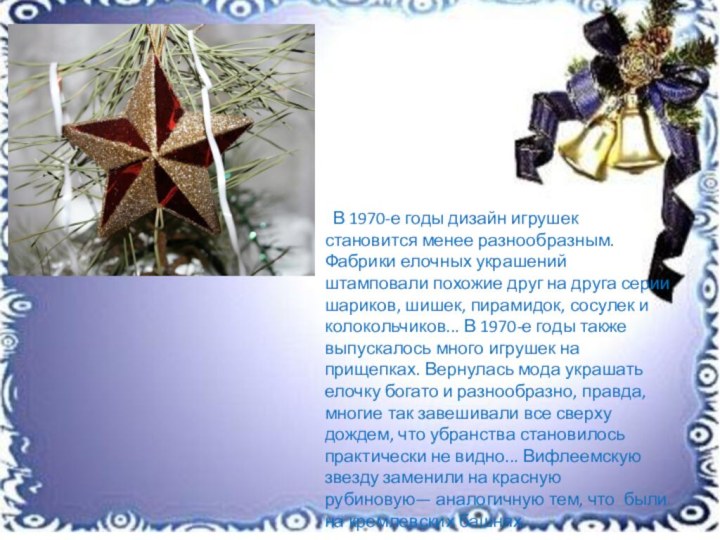 серии шариков, шишек, пирамидок, сосулек и колокольчиков... В 1970-е годы также выпускалось много игрушек на прищепках. Вернулась мода украшать елочку богато и разнообразно, правда, многие так завешивали все сверху дождем, что убранства становилось практически не видно... Вифлеемскую звезду заменили на красную рубиновую— аналогичную тем, что были на кремлевских башнях.