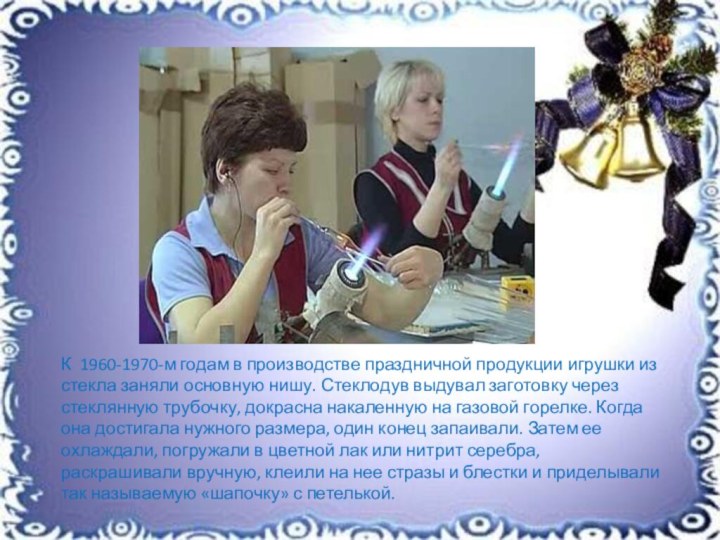 стеклянную трубочку, докрасна накаленную на газовой горелке. Когда она достигала нужного размера, один конец запаивали. Затем ее охлаждали, погружали в цветной лак или нитрит серебра, раскрашивали вручную, клеили на нее стразы и блестки и приделывали так называемую «шапочку» с петелькой.