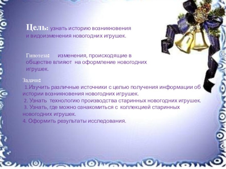 Цель: узнать историю возникновения и видоизменения новогодних игрушек.