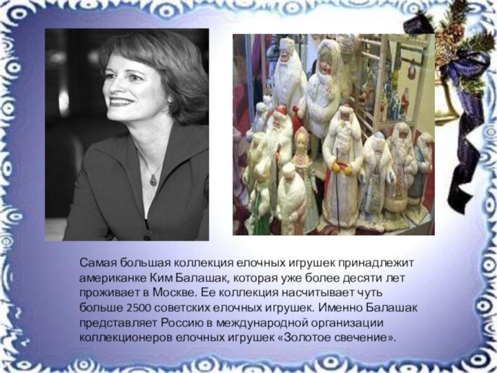 Ее коллекция насчитывает чуть больше 2500 советских елочных игрушек. Именно Балашак представляет Россию в международной организации коллекционеров елочных игрушек «Золотое свечение».