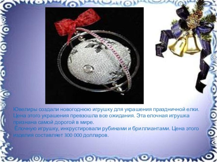 Ёлочную игрушку, инкрустировали рубинами и бриллиантами. Цена этого изделия составляет 300 000 долларов.