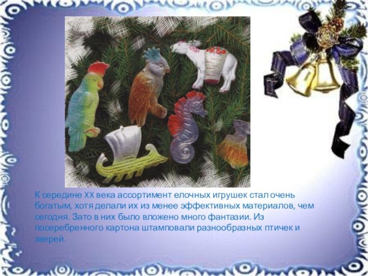 чем сегодня. Зато в них было вложено много фантазии. Из посеребренного картона штамповали разнообразных птичек и зверей.