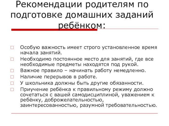 Слайд 6 Рекомендации родителям по подготовке домашних заданий ребёнком: