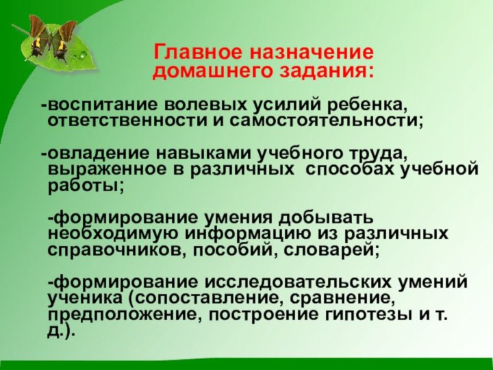 Главное назначение домашнего задания: воспитание волевых усилий ребенка, ответственности и самостоятельности;