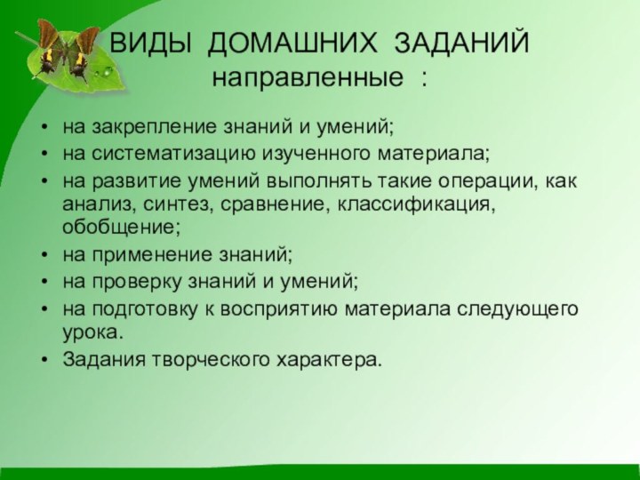 Слайд 4 ВИДЫ ДОМАШНИХ ЗАДАНИЙ направленные :