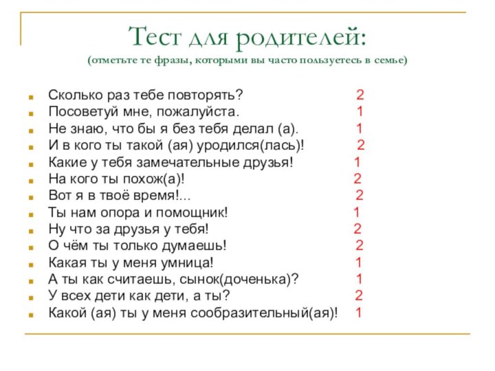 Слайд 7 Тест для родителей: (отметьте те фразы, которыми вы часто