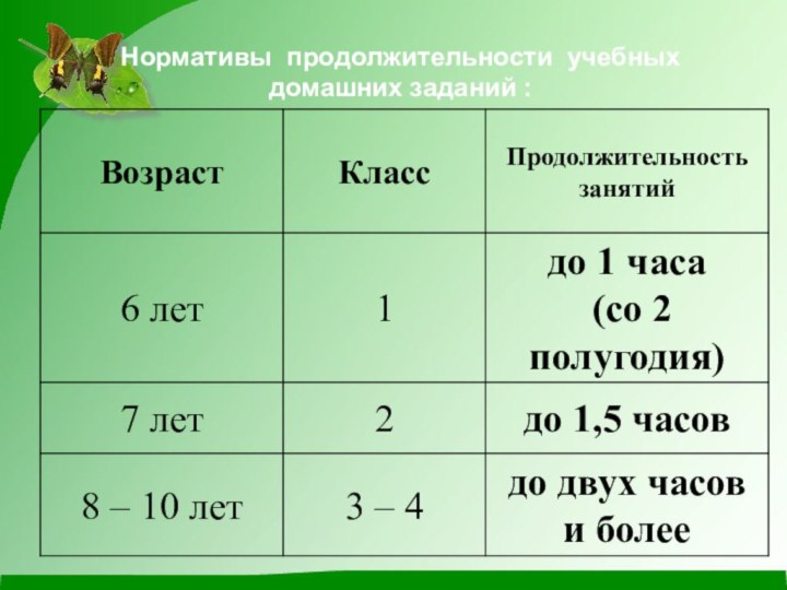 Слайд 5 Нормативы продолжительности учебных домашних заданий :
