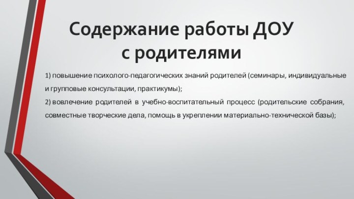 творческие дела, помощь в укреплении материально-технической базы);Содержание работы ДОУ